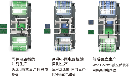 此外,双搬运轨道轨道规格机还可以同时进行2个电路板种类的平行生产,可以大范围地对应各种电路板尺寸和生产方法